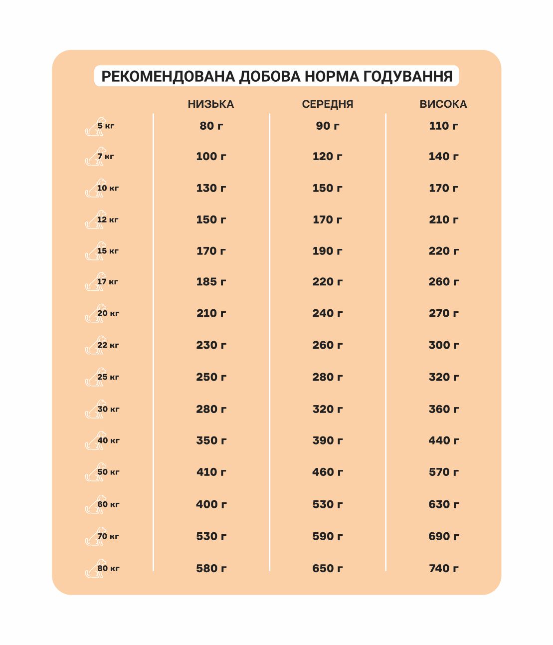 Рекомендації щодо добової норми годування вказані поруч із основним зображенням продукту.
